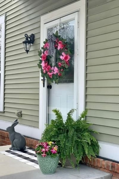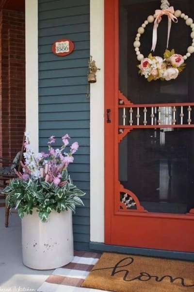 So this is what the wide shot looks like now that we’ve got her all ready for spring. A nice freshly painted door with a wreath and some brightly colored flowers.